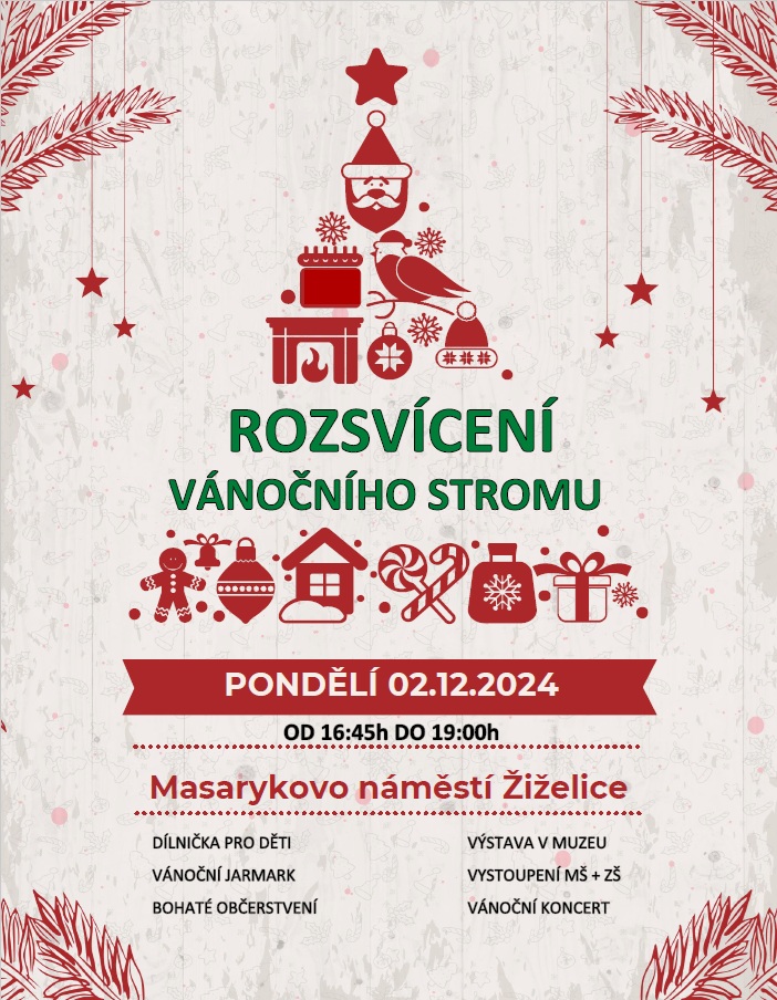 Rozsvícení vánočního stromu se uskuteční v pondělí 2.12.2024 od 17h na náměstí v Žiželicích.